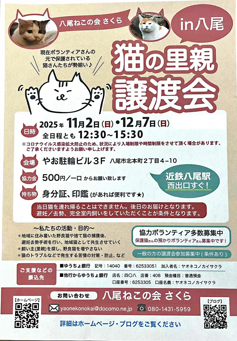 私たちは大阪府八尾市を中心に、ねこ好きが集まってTNR活動、ねこの譲渡会などをボランティアで行っています。 少しでもかわいそうなねこさんを減らしたり、ねこさんに本当のおうちで幸せになってもらう活動をしています。